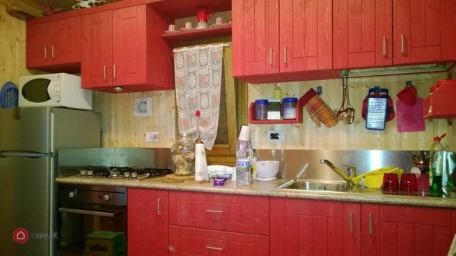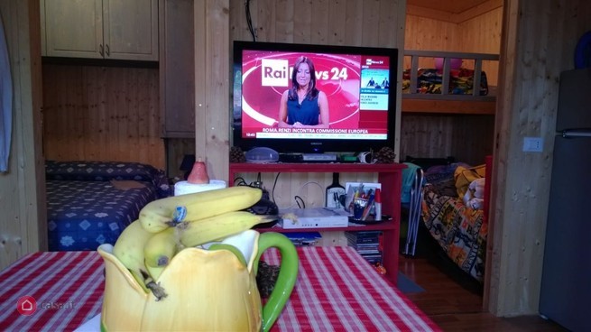 - Cucina soggiorno con parete attrezzata con mobiletti in legno decapé rosso, piano cottura, forno, frigo, tavolo e dinetta trasformabile in letto, condizionatore estate /inverno.