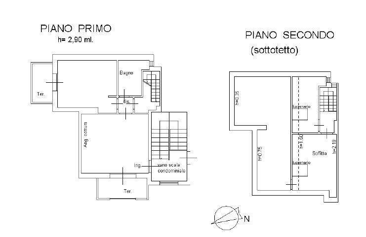 L'appartamento situato al piano primo con accesso da vano scala a comune è composto da soggiorno/cucina con accesso alla terrazza, disimpegno, camera matrimoniale con accesso alla terrazza, bagno finestrato; al piano secondo sottotetto abitabile composto da camera, bagno finestrato e ripostiglio.
