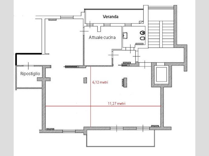 Ampio spazio open space pari a 70 mq, due ulteriori ambienti, bagno, ripostiglio/archivio, veranda, balcone, doppio ingresso.