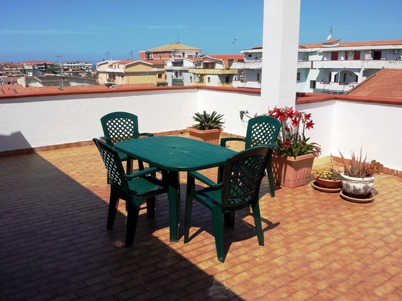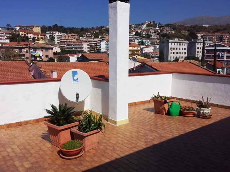 Scalea, Via San Francesco, traversa della più conosciuta Via Lauro, zona centrale residenziale abitativa, a 550 metri dal pieno centro (Piazza Caloprese, Isola Pedonale, centro storico), a 550 metri dal mare e da Corso Mediterraneo, a 650 metri dal centro commerciale, il tutto facilmente raggiungibile a piedi. La zona in oggetto è ottimamente servita da ogni genere di attività commerciale. L'appartamento in oggetto è inserito all'interno di un condominio abitato tutto l'anno. L'area condominiale è recintata con accesso carraio e pedonale. Ci sono diversi posti auto assegnati ognuno ad un appartamento. I costi di gestione sono bassi. L'attico di 90 mq è posto al quarto e ultimo piano. E' composto da ingresso, salone, cucina semi abitabile, ripostiglio predisposto per diventare un secondo bagno, due camere da letto matrimoniali, bagno, piccolo terrazzino di 10 mq con accesso dalle due camere da letto, ampia e comoda terrazza di 50 mq con accesso dal salone e dalla cucina. Le rifiniture dell'immobile sono di ordinaria fattura, risalenti all'epoca di costruzione (1982 circa). Lo stato di manutenzione è adeguato alle esigenze abitative. La luminosità è ottima essendo un ultimo piano esposto a sud, ovest e nord. La terrazza di 50 mq è un'unicità all'interno della conformazione urbanistica della cittadina, difficile da trovare. Uno spazio esterno utilissimo da maggio a fine ottobre dove si può godere di bellissime e calde giornate, da attrezzare e personalizzare a proprio piacimento.