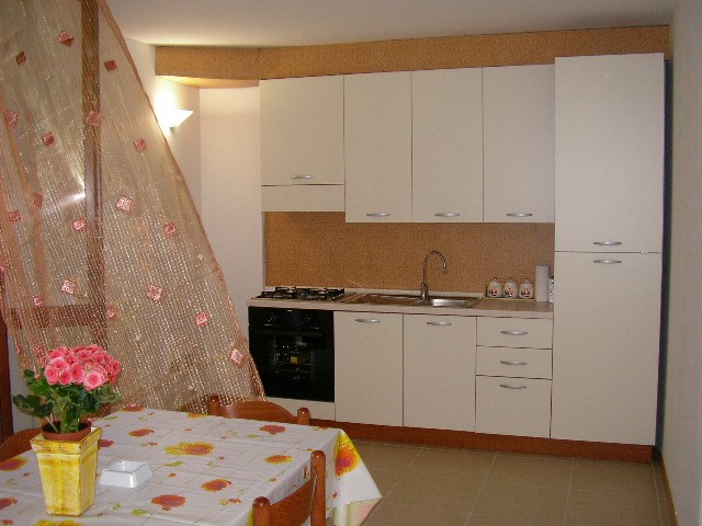 L'appartamento è fornito anche di angolo cottura, reti in doghe in legno e materassi per quattro persone e un ampio armadio.