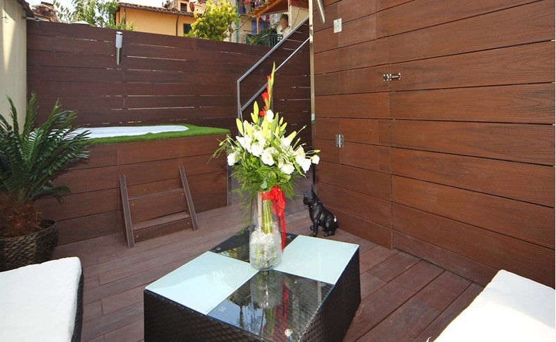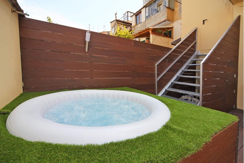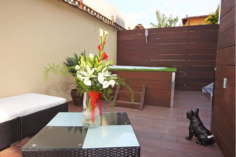 Terra e misura 59 mq e dispone di 30 mq di giardino attrezzato con vasca idromassaggio e mobilia da esterno con pavimentazione in tec.