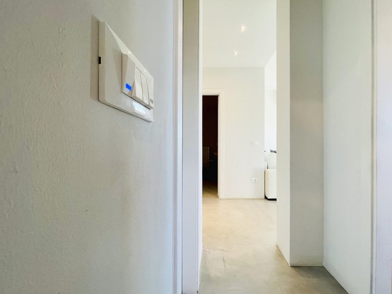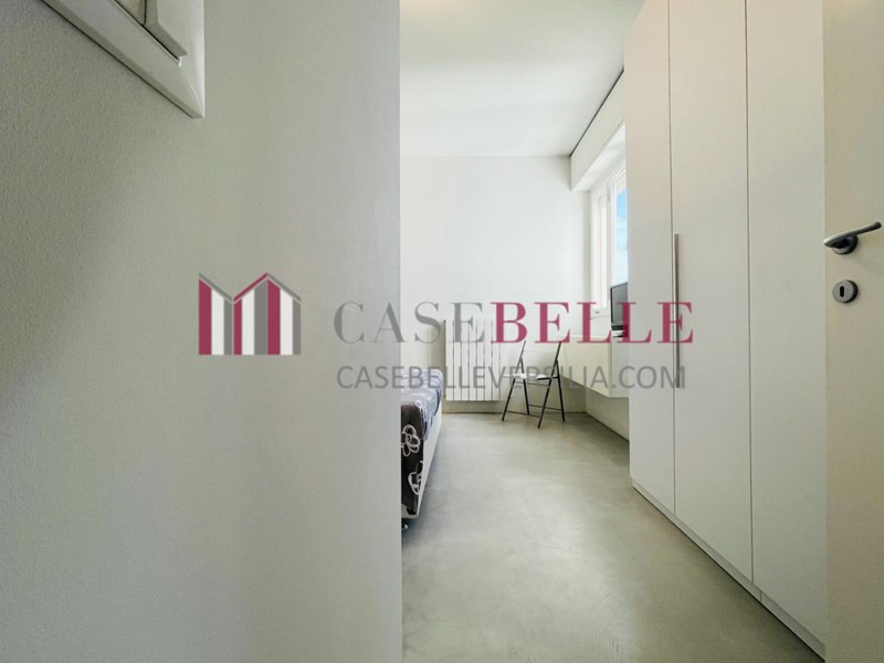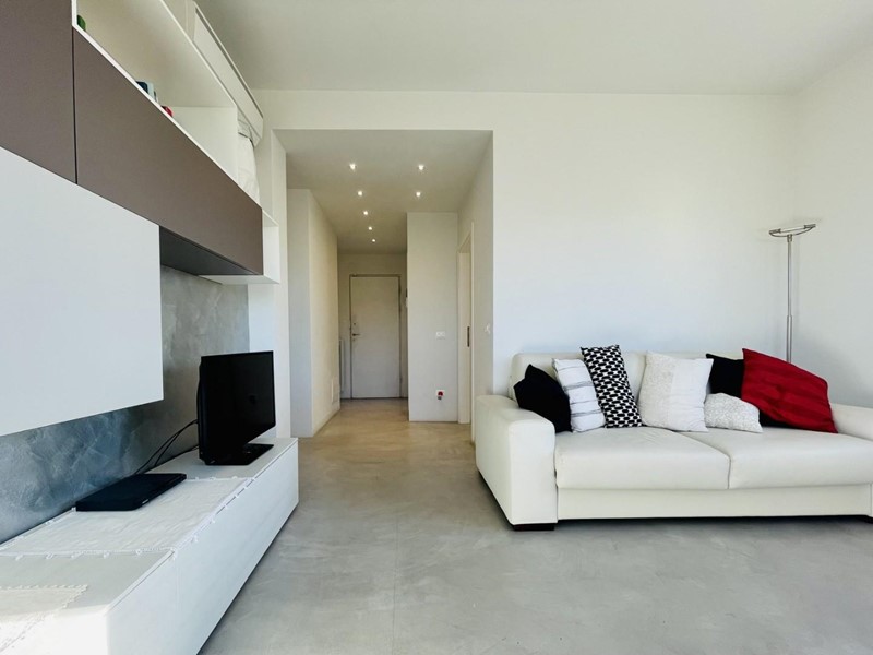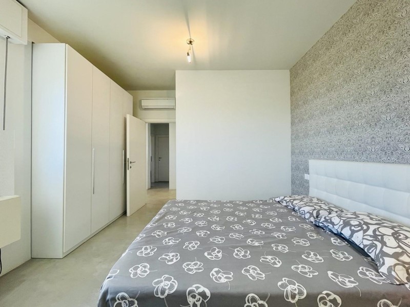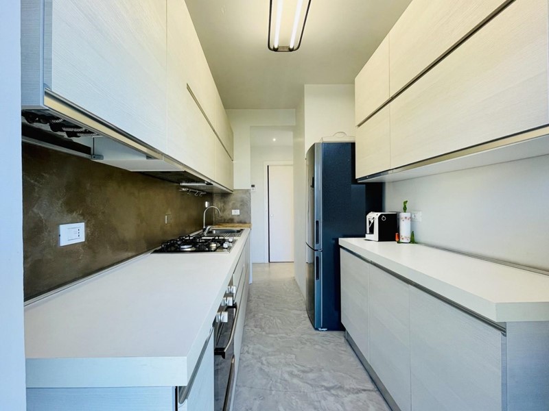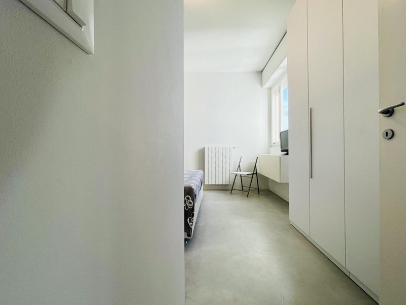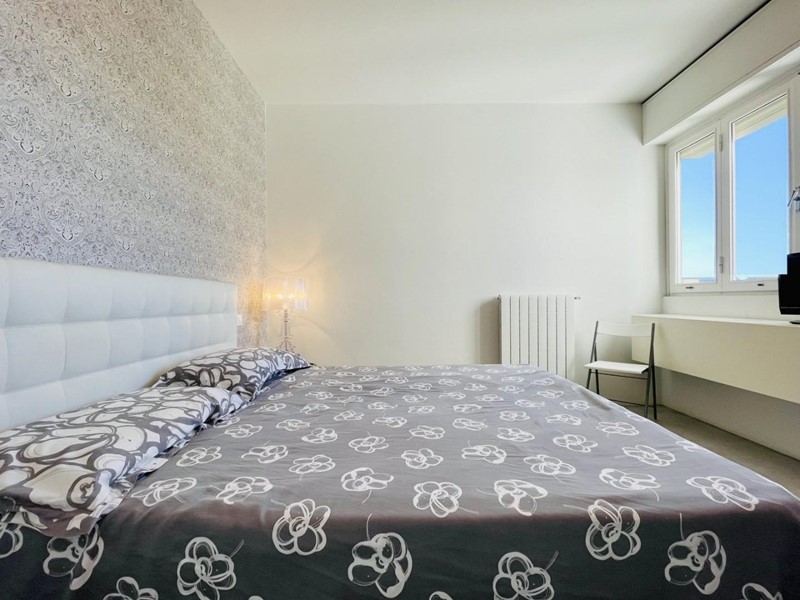 L'alloggio si apre su disimpegno, un cucinotto con balcone tecnico ed uno spazioso soggiorno contemplano la zona giorno. Dal soggiorno si accede ad una comoda e grande terrazza pranzabile (dotata di tende) che vanta una pregevole vista sul mare. L'appartamento dispone di due camere matrimoniali, una cameretta-stanza armadi (senza finestra) e due servizi organizzati con doccia.