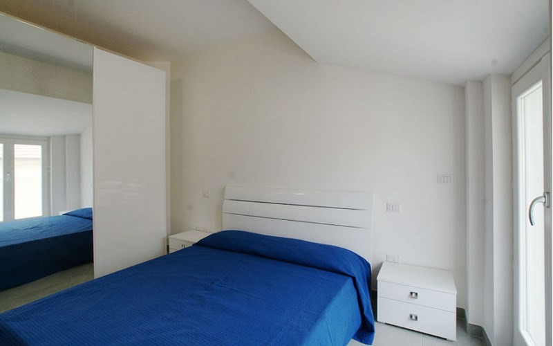Appartamento Tipologia D (posti letto 4+2): collocato al piano terzo, composto da soggiorno con angolo cottura e divano letto matrimoniale, 1 camera matrimoniale,1 camera doppia con letto estraibile, 1 bagno con box doccia ed ampi terrazzi.