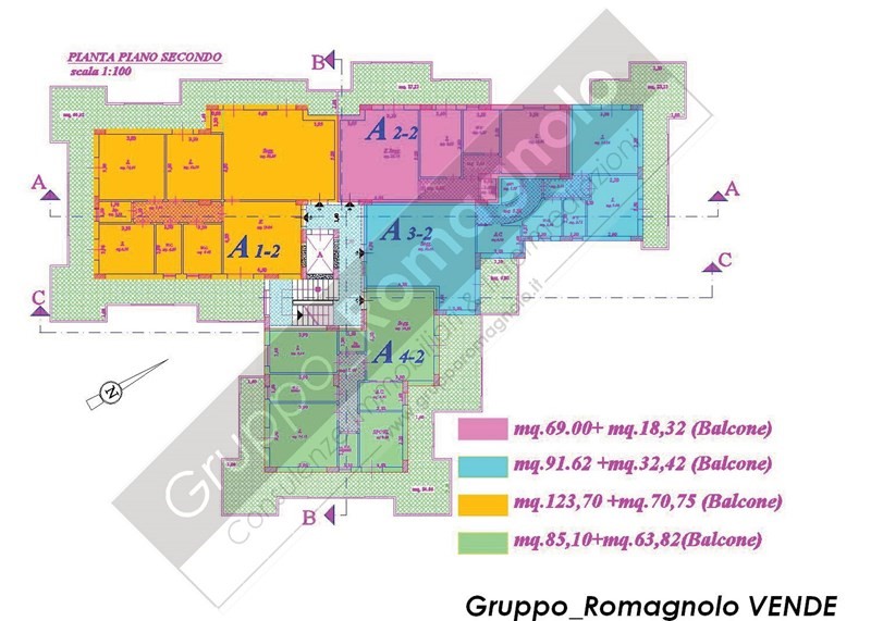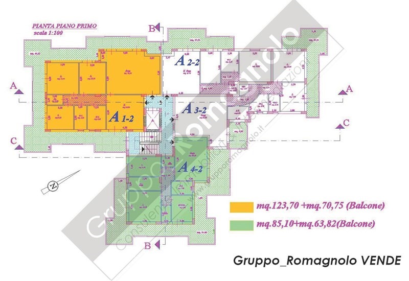 - A1-2 appartamento di mq. 123,70 + mq. 70,75 di balconi e verande, composto da ingresso/pranzo-soggiorno, cucina, ripostiglio, n. 3 camere letto e n. 2 bagni.