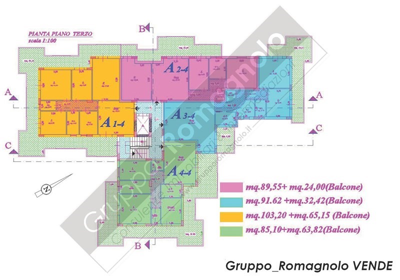 - A1-4 appartamento di mq. 103,20 + mq. 65,15 di balconi e verande, composto da ingresso/pranzo-soggiorno, cucina, ripostiglio, n. 3 camere letto e n. 2 bagni.