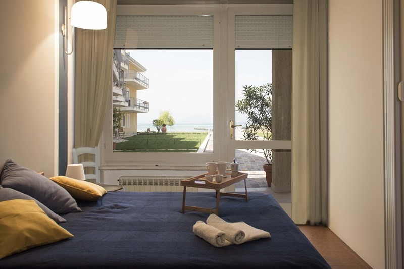 Affittasi (minimo 3 notti) bilocale nel rinomato e storico residence Costa d'Oro Yacht Club di Lugana di Sirmione. Il residence è fronte lago, vicinissimo a negozi di prima necessità e alle terme di Virgilio; dispone di pontile privato, scivolo per barche, campo da tennis, area giochi per bimbi, grande parco, parcheggio privato e servizio di portineria/custode. L'appartamento si trova al piano terra, ed è così composto: ingresso nel soggiorno con divano letto e tv, zona pranzo con angolo cottura e ampia vetrata, da cui si può accedere ad un plateatico vista lago. La camera matrimoniale luminosa e accogliente, gode della stessa vista. Il bagno è finestrato e provvisto di vasca con doccia.