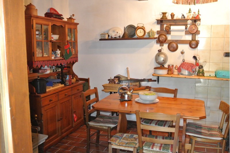 Piano terra con cucina rustica abitabile con travi a vista , camino, due frigoriferi, tavolo e sedie,due applique in stile e faretto ,televisione;