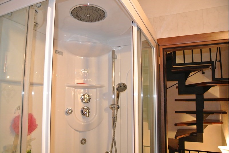 Primo piano , camera matrimoniale con travi a vista munita di armadio, comò e televisione ;bagno munito di cabina idromassaggio/bagno turco;