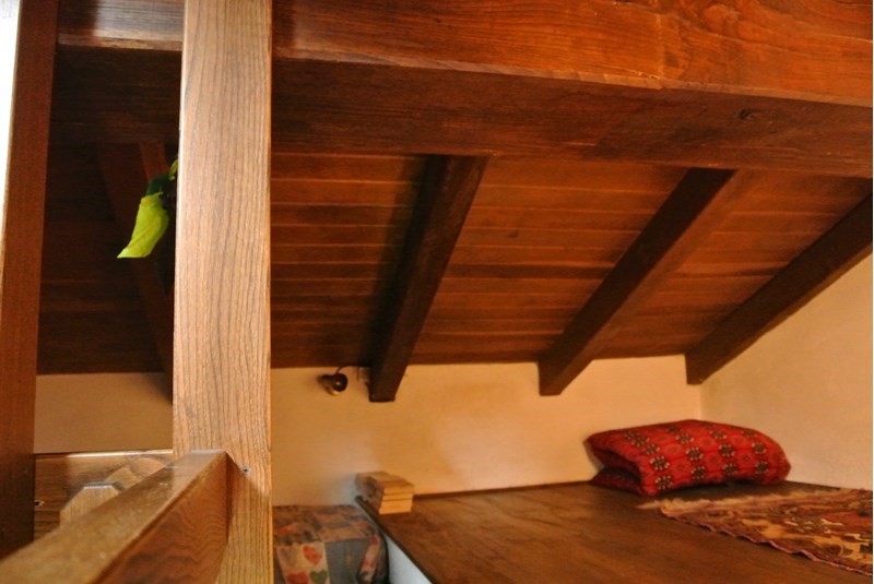 Secondo piano , camera matrimoniale con travi a vista munita di armadio e soppalco in legno da tre posti letto con travi a vista e lucernario, bagno e doccia.