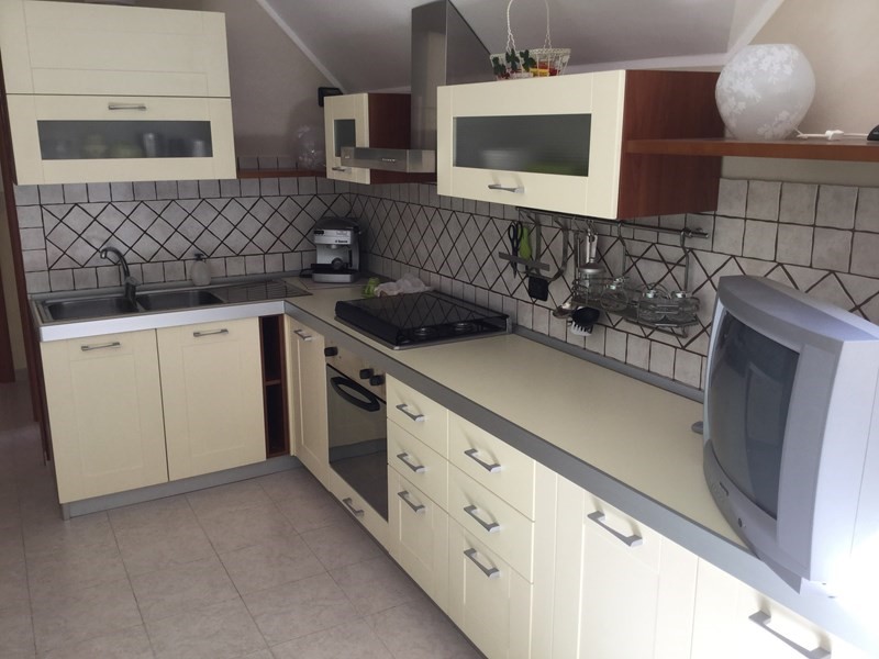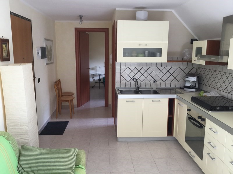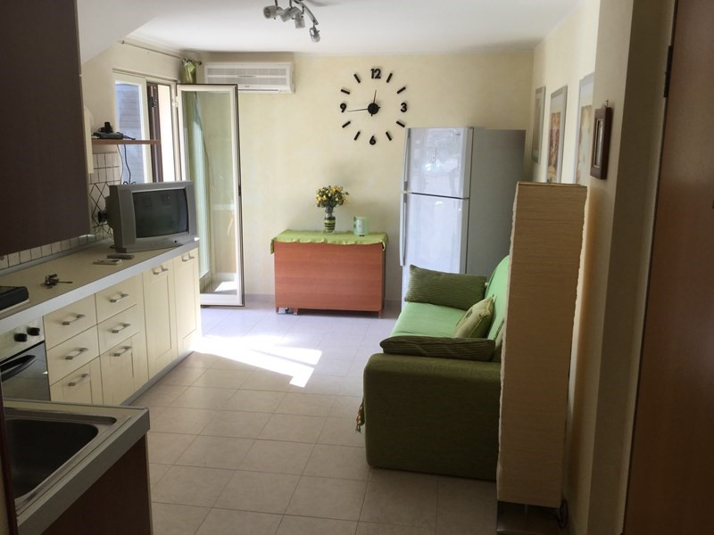 Ingresso su luminosa cucina soggiorno con affaccio su terrazzino panoramico vista mare e monti,comoda camera matrimoniale e bagno con box doccia.