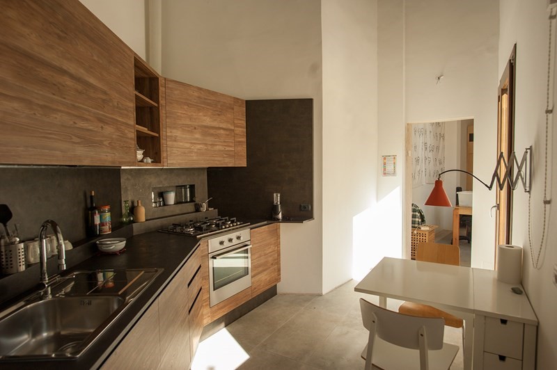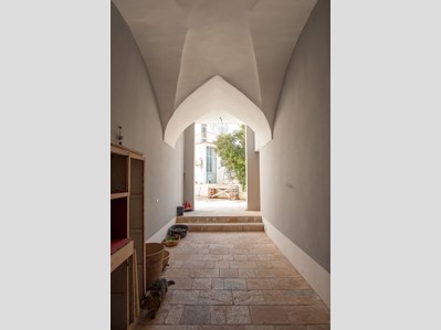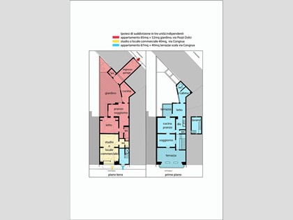 Su via Congrua, un ingresso con vetrina su strada conduce ad uno studio composto da un unico ambiente coperto con due volte a stella e piccolo servizio. Ancora su via Congrua c'è un ingresso autonomo per la scala che conduce al piano primo dove si sviluppa un secondo appartamento (o zona notte) da ristrutturare, composto da soggiorno, letto, cucina, pranzo, bagno, ripostiglio e mansarda. Gli ambienti al primo piano sono impreziositi da due terrazze a livello e pavimenti di tipiche mattonelle in cemento colorato con motivi floreali. L'intero edificio è accatastato come unica abitazione, ma in fase di ristrutturazione sono stati adottati accorgimenti per consentire varie soluzioni di suddivisione. L'ottima posizione centrale, il triplo ingresso e alcune predisposizioni tecniche adottate, ne fanno un ottimo investimento sia per un'unica abitazione che come soluzione con più destinazioni d'uso.