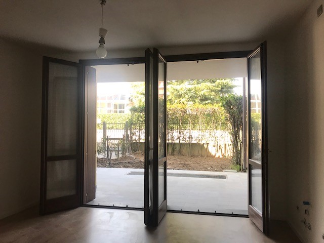 L'appartamento è composto da soggiorno con angolo cottura con affaccio sul un ampio portico, bagno finestrato con doccia e camera matrimoniale che affaccia sul giardino piantumato.