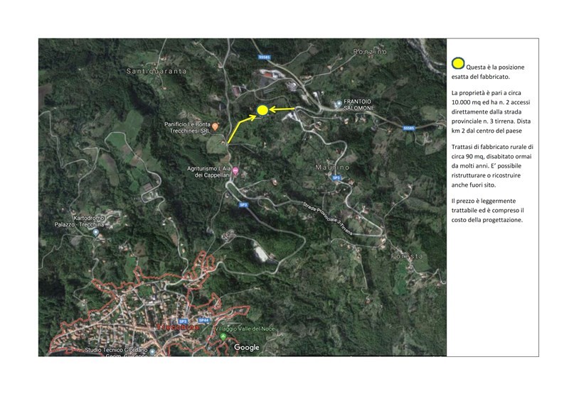 La proprietà è pari a circa 10.000 mq ed ha n. 2 accessi direttamente dalla strada provinciale n. 3 tirrena. Dista km 2 dal centro del paese