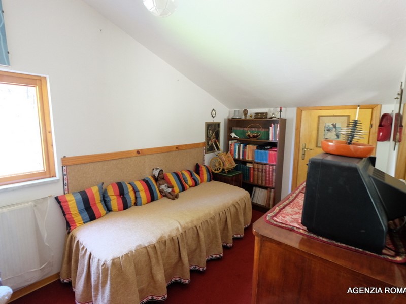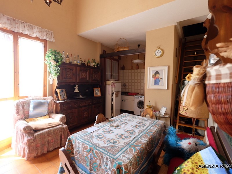 Appartamento posto al primo piano rialzato con giardino, composto da angolo cottura, soggiorno, camera, bagno; al piano mansardato due camere. Box auto.