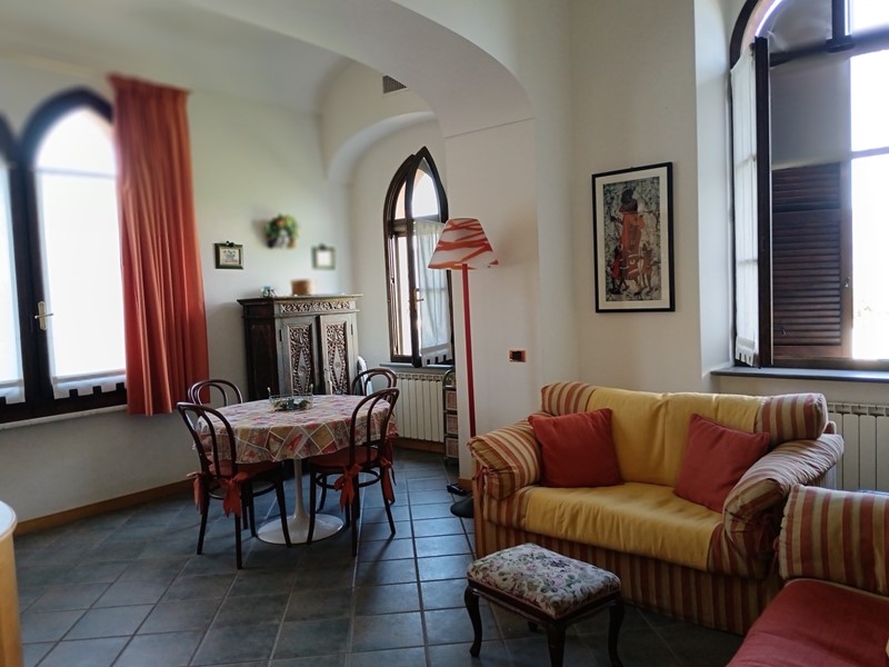 Ameglia - In castello rinascimentale recintato e circondato dal verde appartamento trilocale completamente arredato posto al piano terra composto da ingresso in disimpegno con sopplaco, ampio soggiorno con cucinotto, camera matrimoniale e bagno con doccia. Completa la proprietà Box auto. Rifiniture di pregio, contesto signorile e silenzioso con splendida vista alpi Apuane.