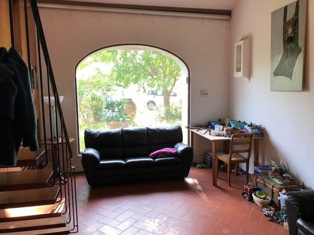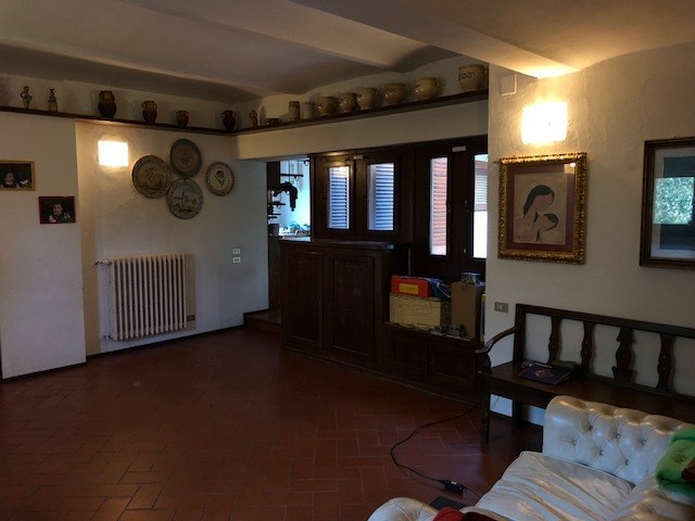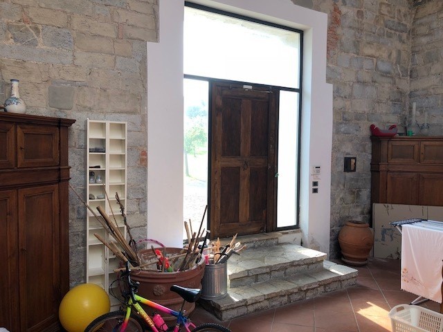 Masotti : In spendita posizione pedicollinare, porzione di villa con chiesa sconsacrata del 1000 (anche quella trasformata in civile abitazione), in bifamiliare, di 300mq e 8 vani, composta da : Ingresso/soggiorno, sala doppia, cucina abitabile con grande camino, studio, ripostiglio e servizio al piano terra, 3 camere matrimoniali (ripristinando 2 matrimoniali e 2 camerette) di cui una con servizio e spogliatoio sul soppalco e altro servizio al primo piano. Completano l'immobile, mansarda abitabile, cantina e locale caldaia seminterrate, garage doppio, rimessa e 12.000mq tra giardino e bosco con 80 olivi in produzione. Classificazione energetica in fase di valutazione.