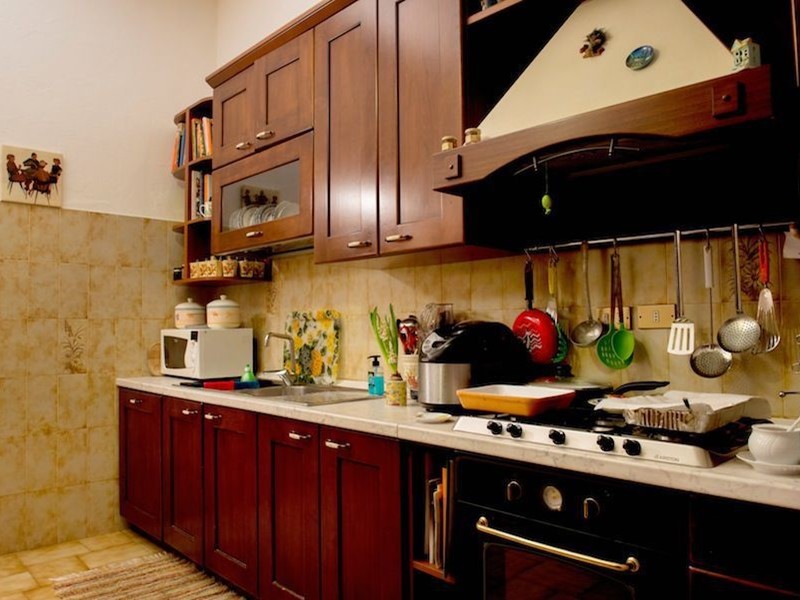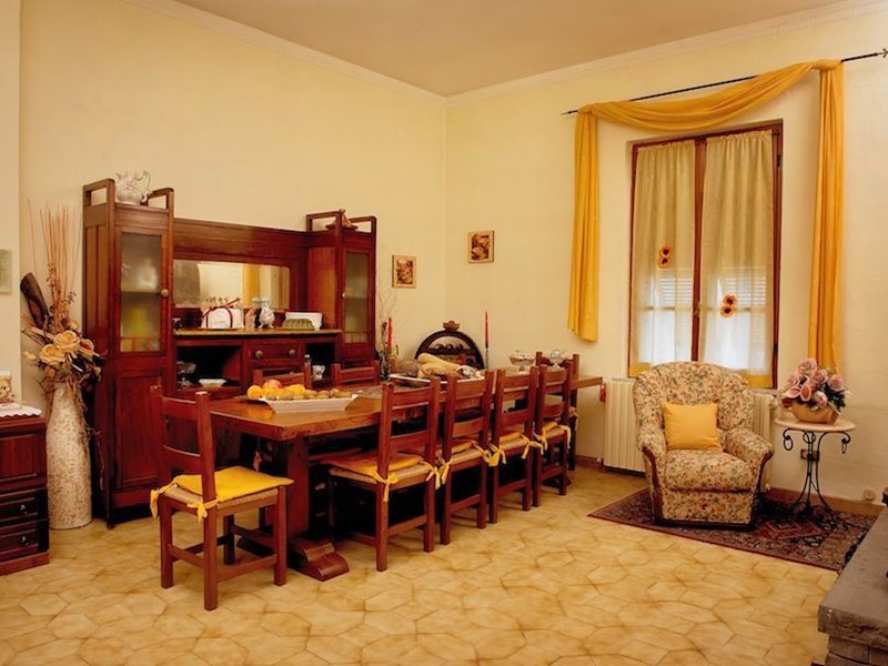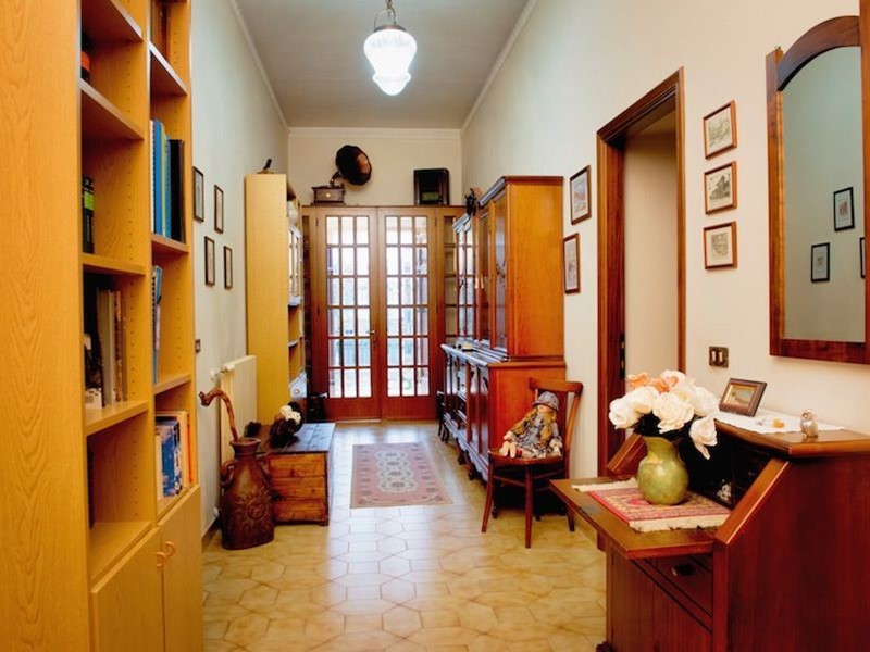 La sala da pranzo ha un camino in muratura in stile toscano. Il salotto si affaccia sulla veranda abitabile, dove organizzare i pranzi delle sere d'estate. Percorrendo il corridoio si accede alle tre camere da letto del piano di sotto e alla sala da bagno padronale. La cucina abitabile è dotata di forno, frigorifero e lavastoviglie di grande capacità. Grande spazio è riservato alla dispensa e ai pensili.