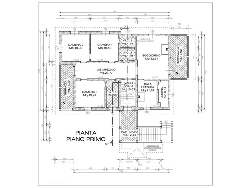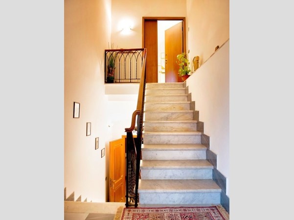 La scala interna in marmo di Carrara collega i piani dei due appartamenti e si estende fino al piano interrato, dando spazio alla doppia cantina in muratura.