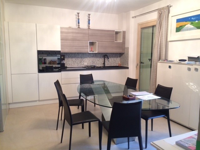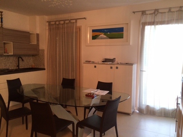 Elegante appartamento in zona centralissima e ben servita, di recente costruzione con impianti all'avanguardia per quanto riguarda il risparmio energetico, composto da ingresso, salottino con caminetto, accesso al soggiorno con angolo cottura da una parete attrezzata con porte a vetri scorrevoli, doppio accesso alla vivibile terrazza. Nella zona notte troviamo la camera matrimoniale, una cameretta e doppi servizi, uno dotato di vasca e l'altro di doccia. Di proprietà anche un doppio garage.
