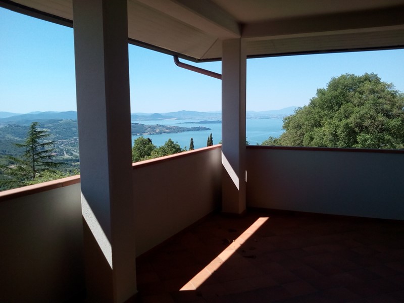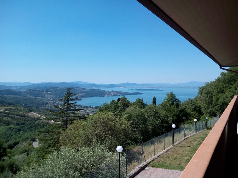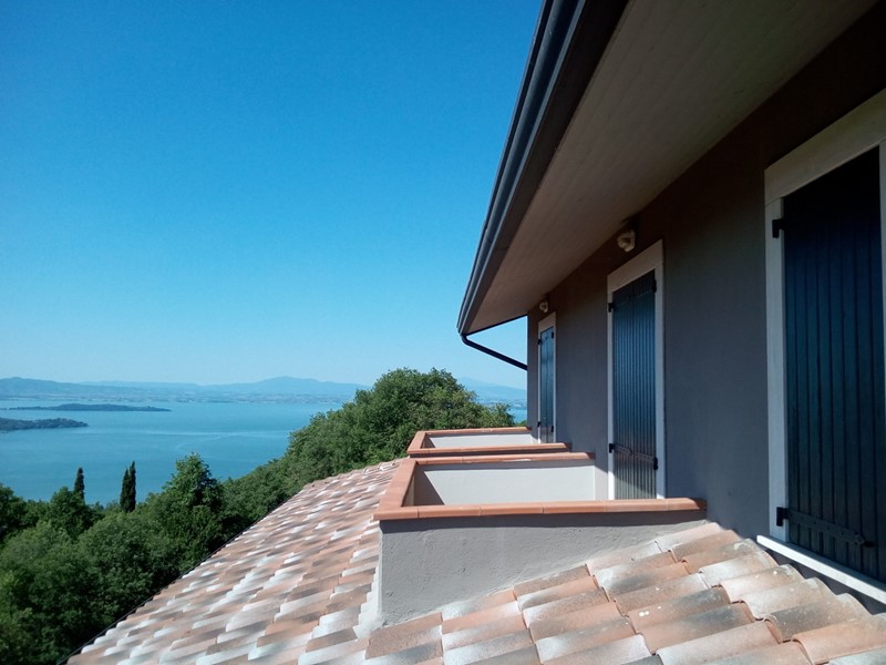 PASSIGNANO SUL TRASIMENO: In Loc. Cerqueto di Trecine, in posizione esclusiva e panoramica con vista sul lago Trasimeno, villa di pregio circondata da un giardino recintato di circa mq. 1.300, in area non più edificabile. Realizzata nel '96 con struttura in cemento armato antisismica, nel 2015 è stata completamente reinterpretata nella sua architettura interna, esterna e per gli arredi. L'abitazione principale di mq.  250 distribuita su due livelli, al piano dell'ingresso ha un ampio e luminoso salone con camino e affaccio sul terrazzo di mq. 80 da cui si gode una suggestiva vista sul Lago Trasimeno con i suoi tramonti, una cucina con camino ed un bagno. Dalla zona giorno due scale distinte conducono al reparto notte al piano superiore, progettato creando due aree completamente indipendenti, ciascuna con due camere con terrazzo ed un bagno. Per un totale di 4 camere e due bagni. Al piano seminterrato da un ampio porticato vista lago di 53 mq., si accede ad una taverna con camino e cucina, oltre ad un bagno ed una lavanderia. Completa questo piano un garage doppio. Gli esterni, con il giardino, il solarium e la possibilità di realizzare una piscina, rendono pienamente godibile in ogni stagione i colori, il panorama e i profumi della natura incontaminata di questa parte dell'Umbria. Classe energetica C. (V37Z)