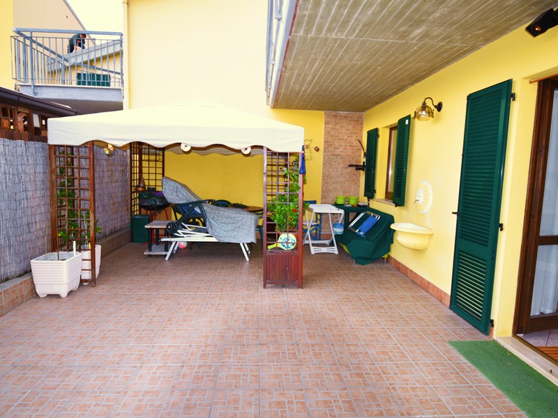 Corte esterna dotata di gazebo e su due porzioni di giardino piantumato con varie essenze arboree e dotato di impianto di irrigazione, fontane e impianto di illuminazione; dispone inoltre di serbatoio di 500 lt per il recupero di acqua piovana. Primo Piano di mq 90 circa con salone zona pranzo e salotto, cucina a vista con penisola, bagno con vasca idromassaggio e ripostiglio.