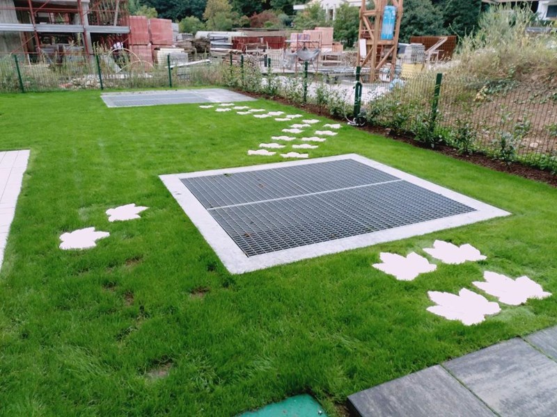 Giardino (335mq) con zona arredata per mangiare fuori davanti alla cucina con copertura mobile (pergolato),
