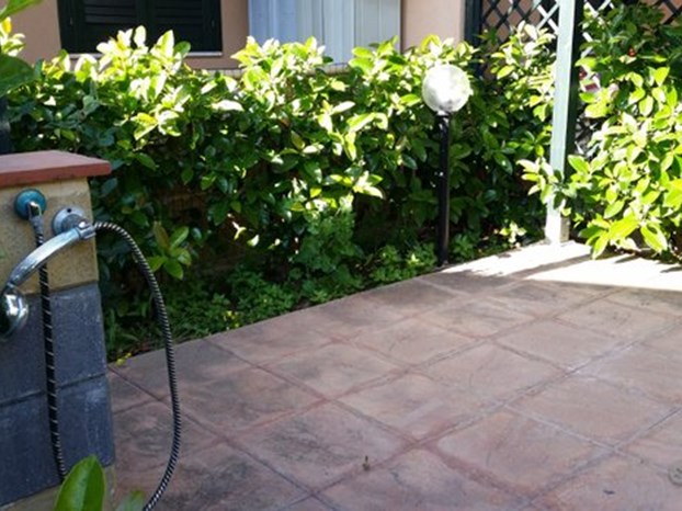 Piccolo giardino privato dotato di cucinino, barbecue in muratura, doccia, tavolo in ceramica, luci e faretto per la sera.