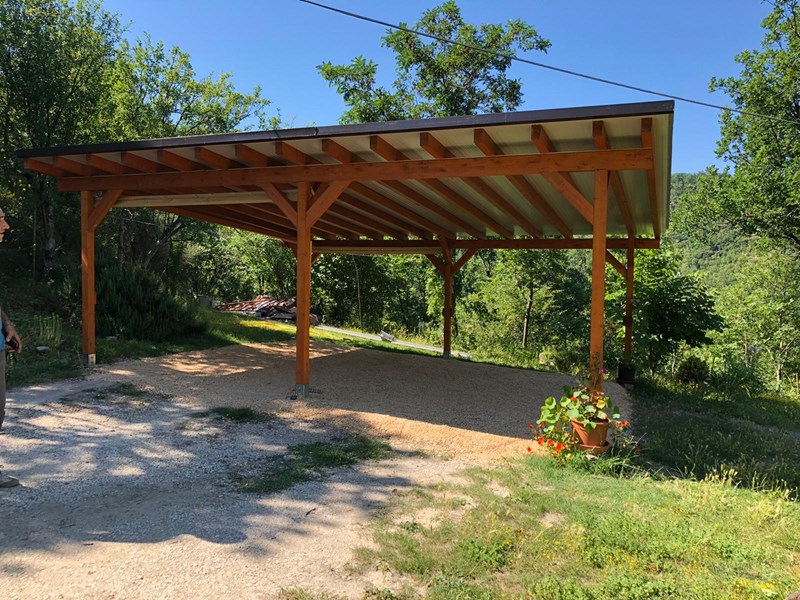 Esternamente presenta un ampio giardino , box/tettoia in legno dove si possono parcheggiare varie auto.