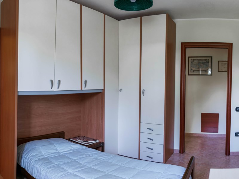 Il terzo appartamento si trova al primo piano ed è composto da soggiorno, cucinotto, bagno e due camere da letto. Parti del soffitto sono realizzate con delle eleganti travi in legno a vista, e oltre al riscaldamento con pompe di calore dispone di una stufa a pellet.