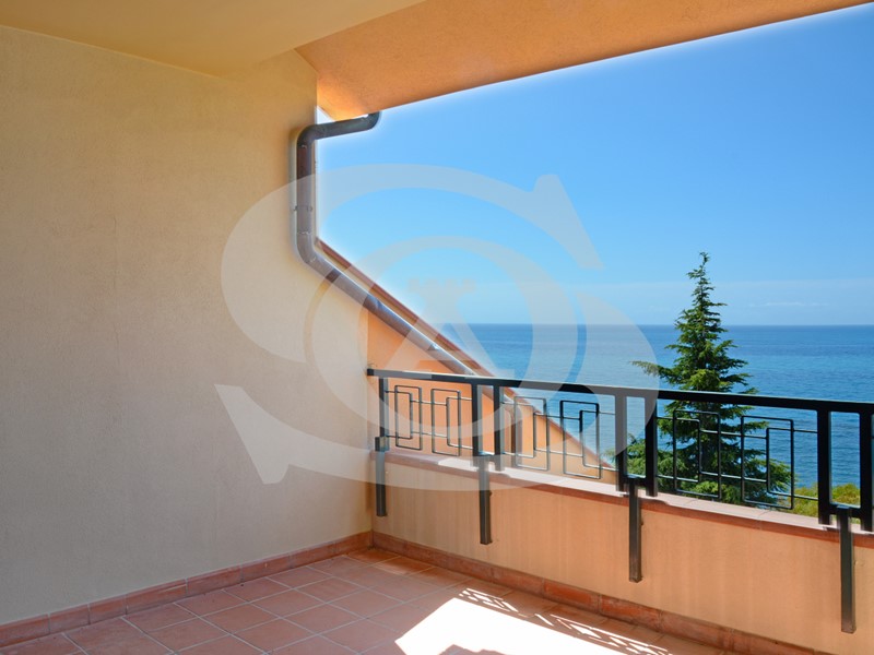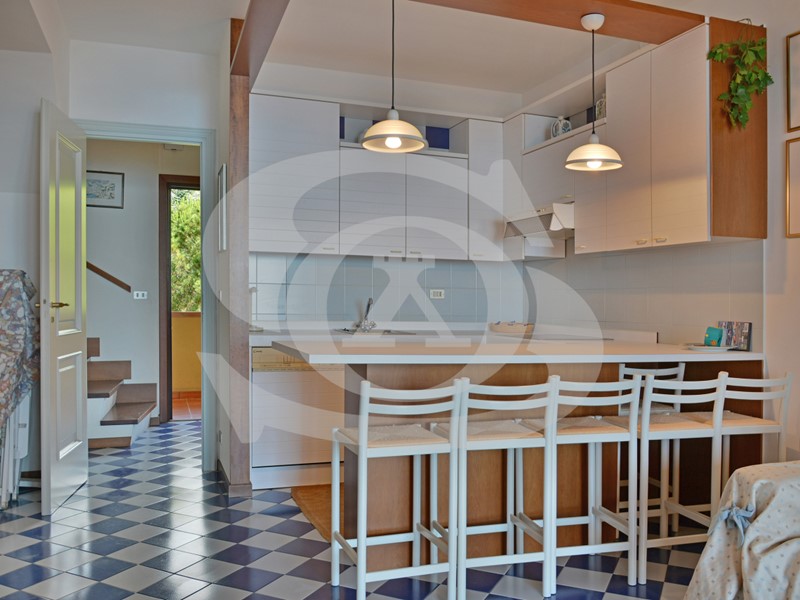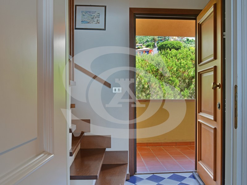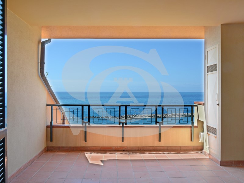 In complesso residenziale, a pochi passi dal mare, dalla pista ciclabile e dal centro di Ospedaletti, affittiamo transitoriamente appartamento trilocale disposto su due livelli, composto al piano terra di ingresso, soggiorno con angolo cottura, bagno e terrazzo loggiato con vista mare, al piano superiore camera e cameretta, bagno e terrazzo con piena vista mare. Riscaldamento autonomo. Posto auto di proprietà.