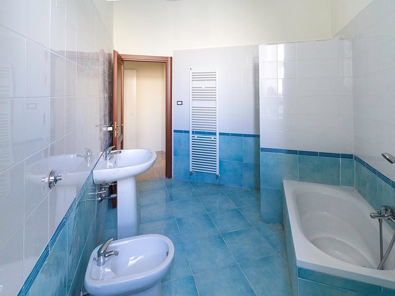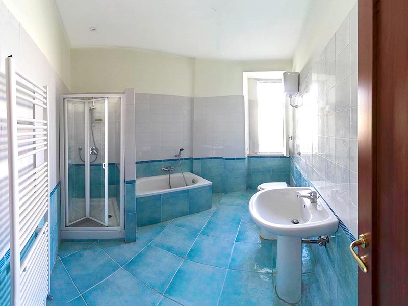 Ampio bagno patronale piastrellato con ceramica di Vietri, arredato con vasca e con cabina doccia, impianti igienici nuovi.
