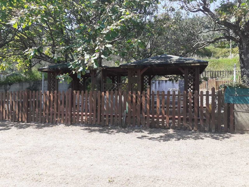 Ha una zona recintata con due gazebi con barbeque e fontana, ideale per l'estate. Nel giardino una enorme voliera di circa 200 mq alta circa sei metri in quanto il vecchio proprietario era un allevatore di uccelli. nel giardino ci sono 17 piante di ulivo che hanno circa trent'anni di vita. Il terreno di proprietà è poco meno di 6000 mq con piante da frutto, vigneto, querce.