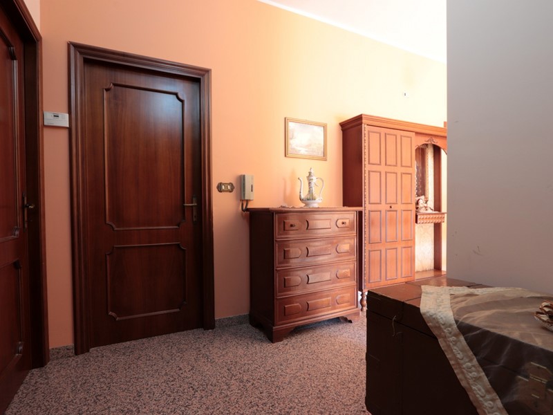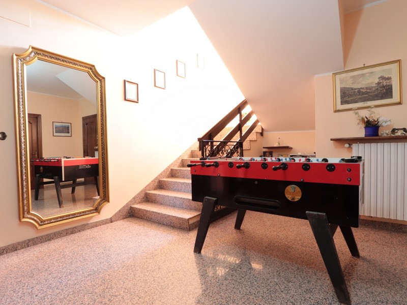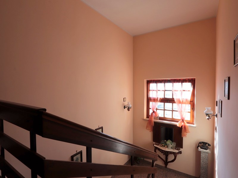 Entrando ci si trova in un ampio soggiorno con bel camino angolare e tramite alcuni gradini si accede ad un piano rialzato con un disimpegno su cui si aprono le porte della zona pranzo, studio, bagno e collegamento interno con il garage. La zona pranzo è articolata in una cucina con camino angolare e porta esterna, una sala colazione ugualmente con un ingresso esterno autonomo ed infine una più ampia sala da pranzo, accessibile anche direttamente dal soggiorno. Il collegamento con il garage consente di raggiungere anche un atrio con uno spazio doccia ed elettrodomestici, un ripostiglio, il garage stesso con porta in metallo basculante ed una scala che scende in un locale seminterrato con finestrelle per luce e areazione, utilizzato come cantina e palestra/sala giochi. Dal disimpegno al piano terra parte una comoda scala in muratura che porta al primo piano dove sono presenti: un bagno, 4 camere da letto di cui una con bagno interno e tre con verande panoramiche. Dal primo piano una scala a chiocciola consente di raggiungere un alto ed esteso sottotetto (altezza max 220 cm, min. 100 cm) dotato di finestre, ripostigli e raggiunto da tutte le utenze, ipotizzabile suddivisione in più locali e conversione ad ulteriore spazio abitativo.