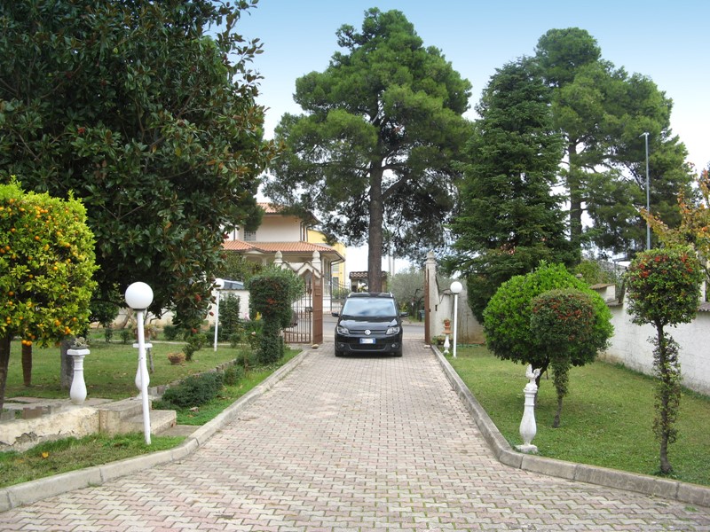 L’ingresso alla proprietà è direttamente sulla via principale attraversando un robusto cancello carrabile in ferro fiancheggiato da un cancelletto pedonale. Percorrendo il viale pavimentato con betonelle o attraversando il giardino si raggiunge la facciata anteriore della villa con due portici che consentono arredamento per attività di vita all’aperto e su cui si aprono l’ingresso principale dell’abitazione ed una porta/finestra come ingresso alternativo (studio).