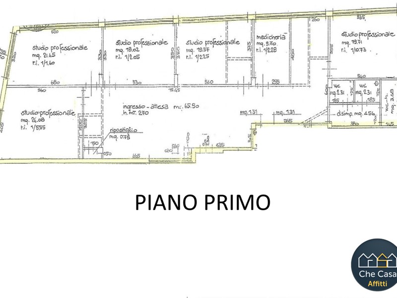 Internamente la soluzione si sviluppa tutta su un piano, entrando troviamo un'ampia sala d'aspetto di circa 66mq, il restante ambiente è suddiviso in 6 ambulatori, oltre che un antibagno e 3 bagni.