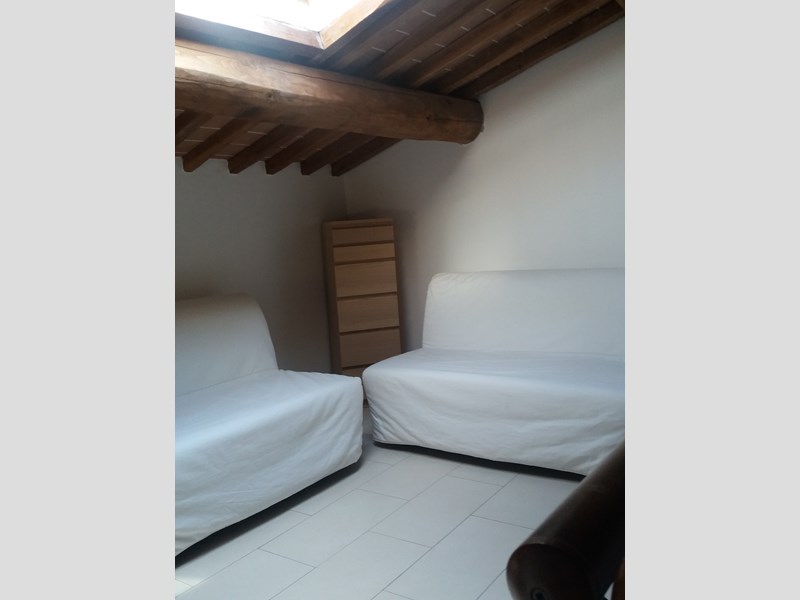 Dal soggiorno si accede, tramite comoda scala, al soppalco con zona tv e due divani letto matrimoniali.