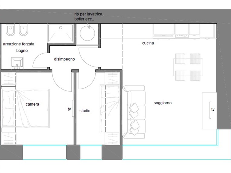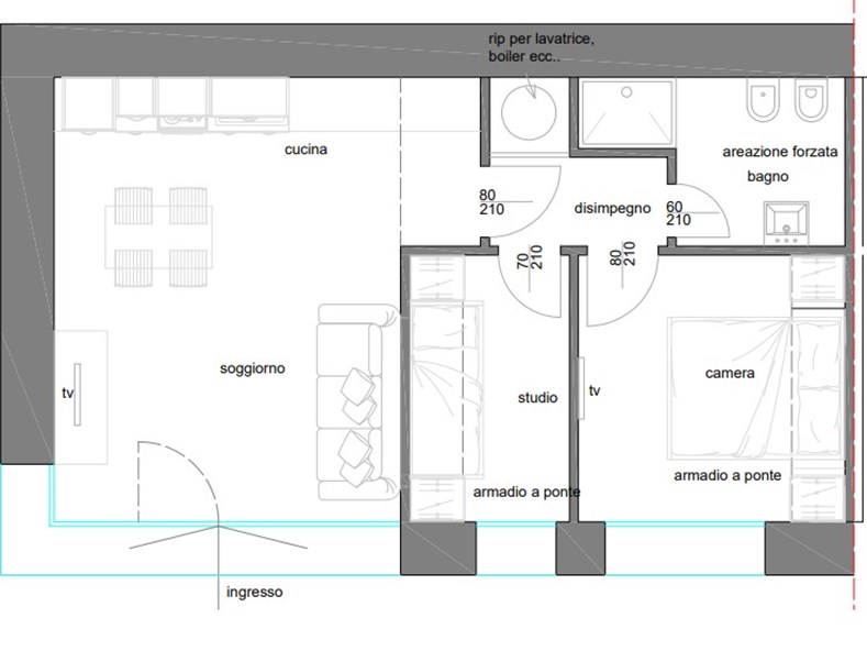 Nel dettaglio i trilocali si compongono di ingresso indipendente, soggiorno con angolo cottura, camera studio, camera e bagno.