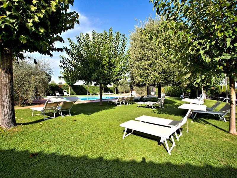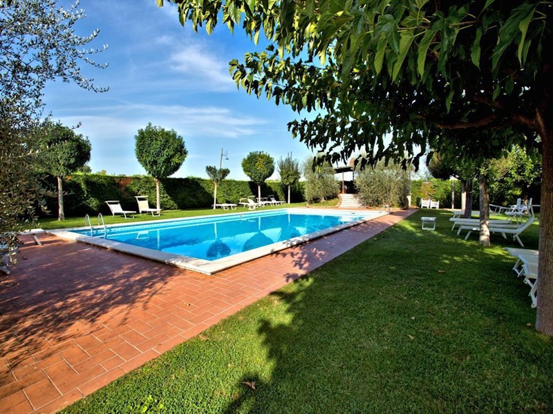 Completano la proprietà i 5.000 mq di giardino ove è collocata la grande piscina immersa nel verde protetta da siepi e alberi ad alto fusto impreziosita da un elegante viale di accesso bordato di cipressi, il grande parcheggio privato e un campo da calcetto.