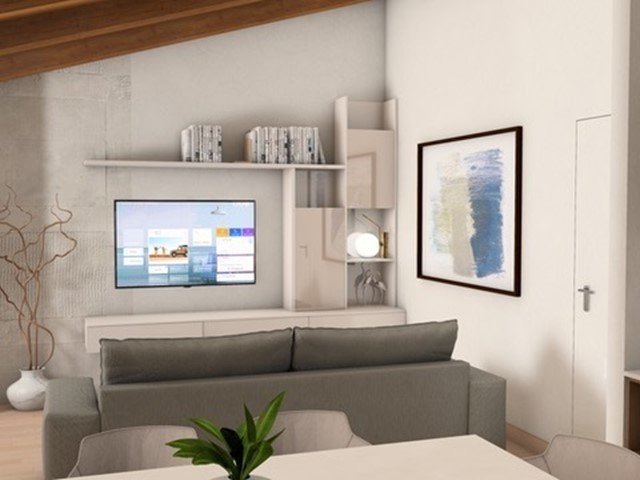 L'immobile è composto da ingresso con corte esclusiva, soggiorno con cucina a vista, il disimpegno ci porta nel reparto notte dove troviamo un servizio con vasca, una camera matrimoniale una cameretta entrambe con portafinestra con accesso diretto al giardino sul retro.