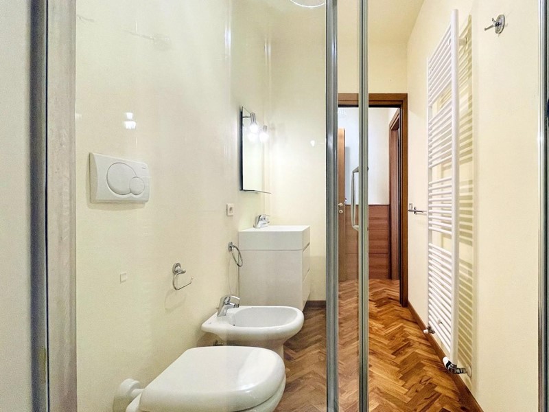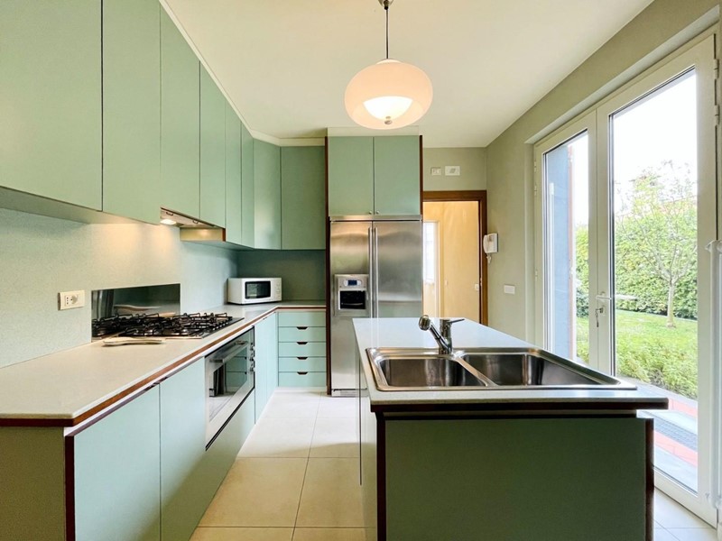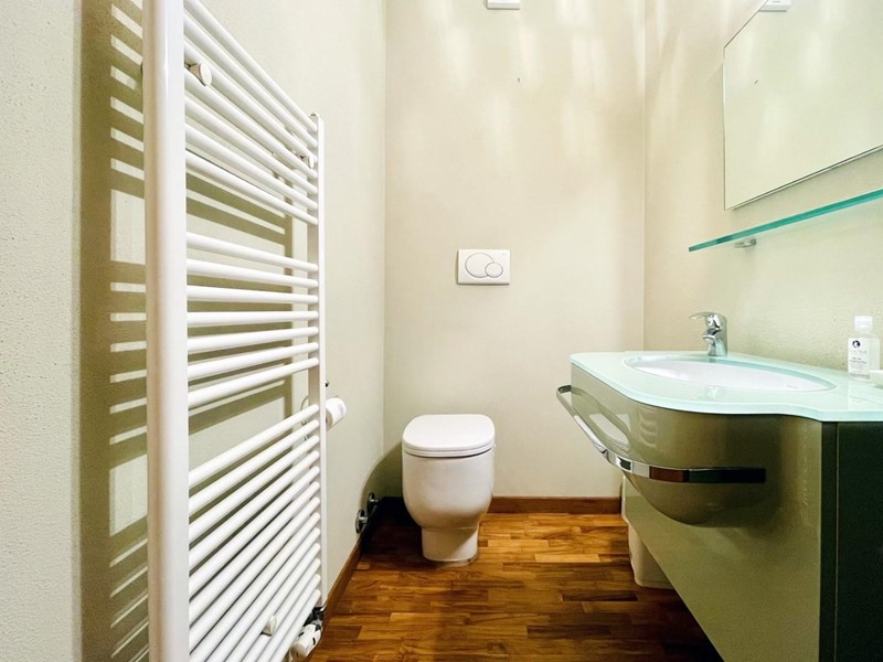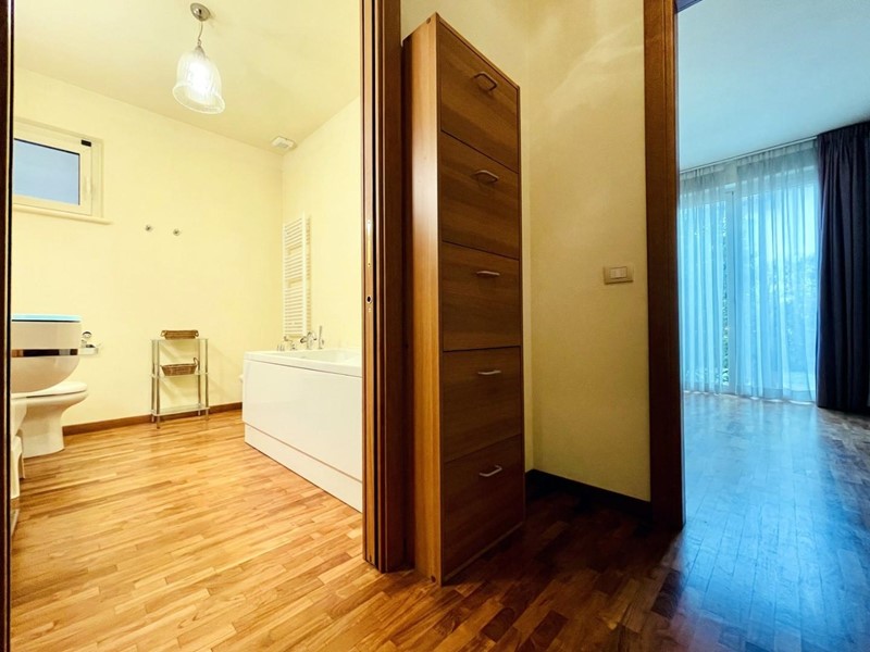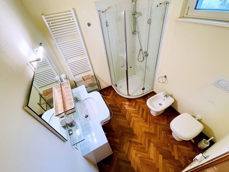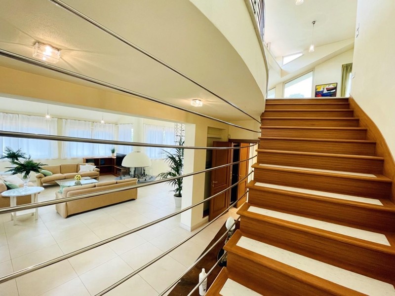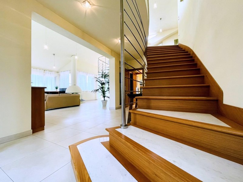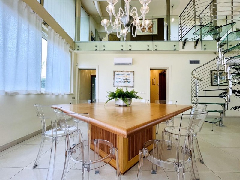 A dare carattere al soggiorno troviamo la scala centrale di design (in cristallo) che collega il piano terreno al piano superiore. Il piano terra dispone di una spaziosa cucina abitabile, una camera matrimoniale con bagno (2 pax) ed un secondo bagno, di servizio.
