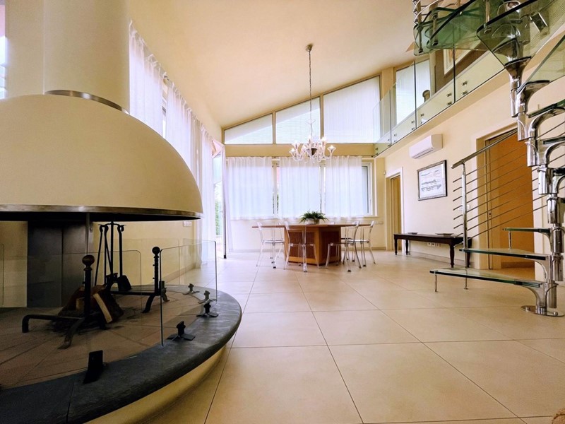 L'ingresso principale avviene nell'ampio e luminoso soggiorno servito da sala pranzo. Questo grande vano gode di un'esposizione notevole grazie alle innumerevoli vetrate che fanno da perimetro all'intero ambiente. Lo spazio è evidenziato inoltre dalla doppia altezza.