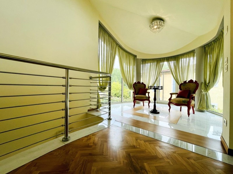Attraverso le scale in marmo o quelle di cristallo si raggiunge il piano piano della villa. Questo spazioso soppalco è occupato da una piacevole zona relax dotata di pianoforte e area studio. Il soppalco domina l'ingresso principale.
