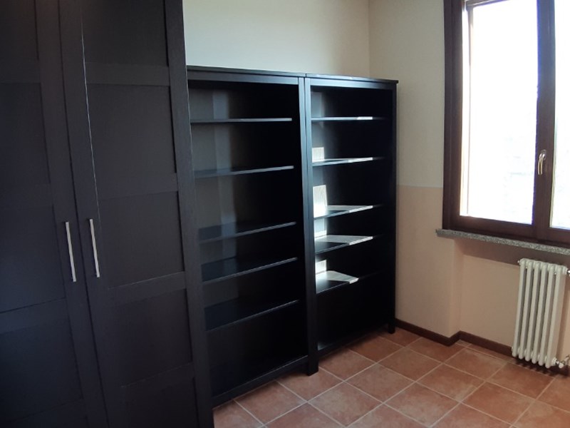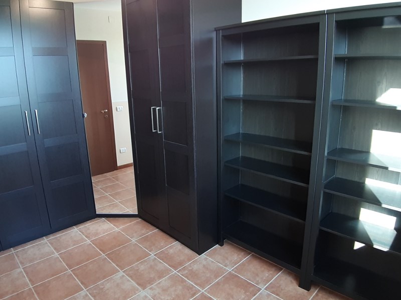 Seconda camera da letto utilizzabile anche come studio, con armadio ad angolo e libreria.