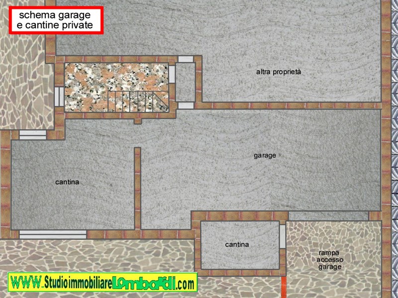 Per finire la descrizione dell'oggetto si passa alla parte seminterrata, dove insiste con rampa di accesso singola, un'ottimo garage grande di 45 mq, corredato da due cantine con superficie di 35 mq totali.