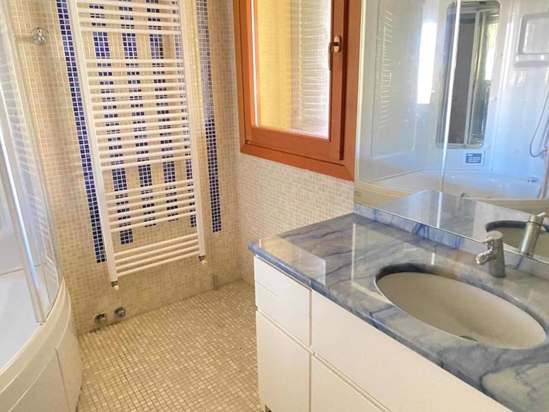 On the ground floor there is a large living room that crosses the house, which deeply diffuses the brightness that features the villa and from which reaches the large private garden with a paved patio. In the middle of the room there is a suggestive fireplace that splits the living room into two sides, giving character and elegance to the environment.