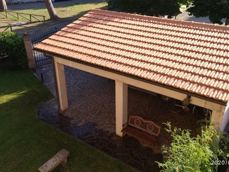Grande giardino di 275 MQ, di cui 77 MQ di porfido, e 156 M. di prato, tettoia di 6,95M. x 6,70M. costruzione antisismica con travi e travicelli di Castagno e mezzane, con isolamento termico del tetto, predisposizione di tamponatura. Irrigazione automatica con deposito da 1000 L. interrato (acqua industriale), con entrata indipendente, con cancello in ferro battuto pieno, apertura automatica.