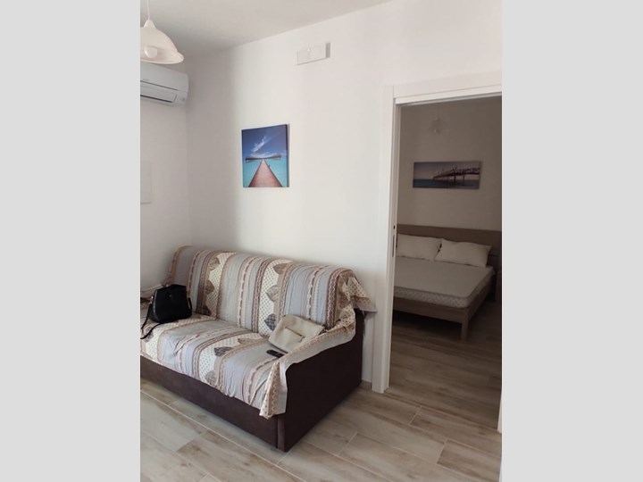 E' costituito da un soggiorno, caratterizzato da ampia vetrata panoramica, dove vi è un divano letto comodissimo per 2 persone; la cucina a vista è dotata di tutte le stoviglie necessarie per cucinare in autonomia, la camera da letto principale ha anche l'ingresso indipendente direttamente dal portico ed ha un bagno privato finestrato completo di box doccia e servizi wc.