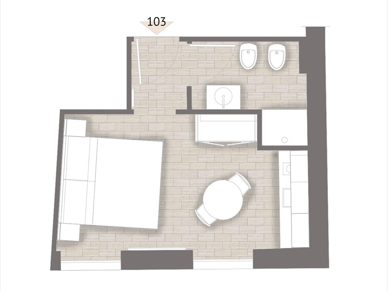 l'ingresso su un unico ambiente si divide in zona giorno e zona notte, dove è presente anche l'angolo cottura.