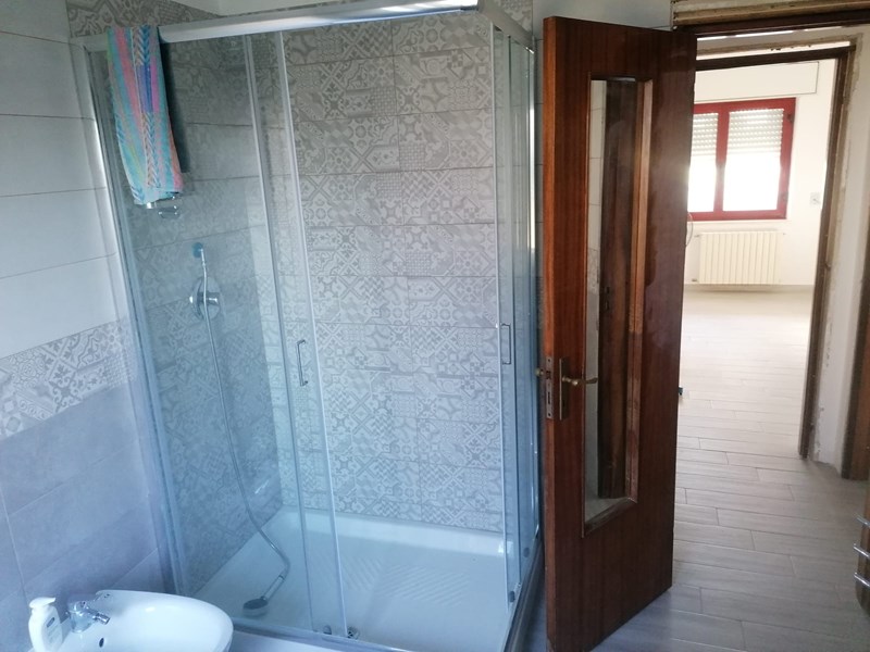 Un bagno con doccia e lavatrice - tutti gli elettrodomestici (frigorifero, forno, lavatrice) sono nuovi.